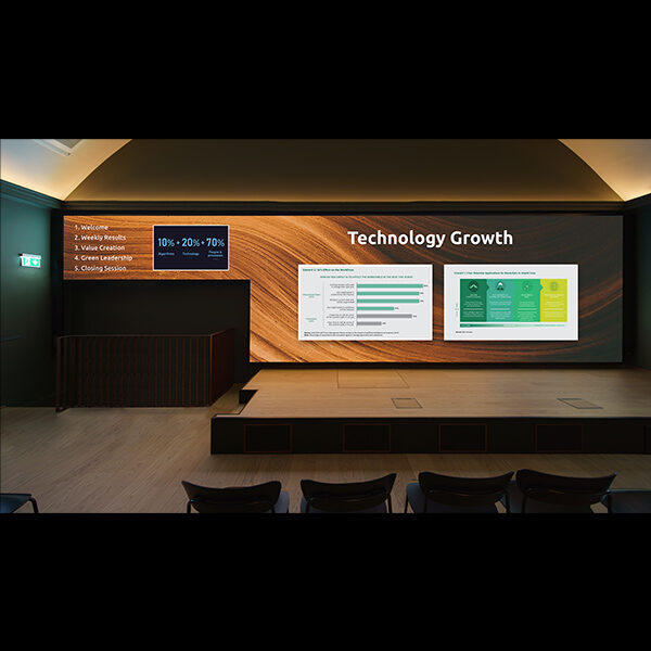 Ziel war es, herausragenden Ergebnissen eine geeignete Plattform zu geben. Darüber hinaus strebten wir eine universelle Nutzbarkeit nicht nur für interne Veranstaltungen, sondern auch für Kundenpräsentationen, Teambesprechungen und gesellschaftliche Anlässe an. Wir erhielten 18m² Visualisierungsfläche auf einer eher ungewöhnlichen Wand.